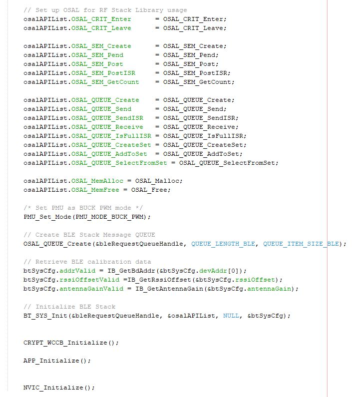 Initialization routines for OSAL, RF System, and BLE System are auto-generated by the MCC. See OSAL Libraries Help in Reference Documentation from Related Links. Initialization routine executed during program initialization can be found in the project file.