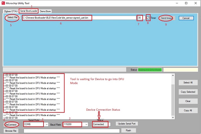 Tool will wait for WBZ351device to be in DFU mode for a time period entered in step 7(Default 30 sec)