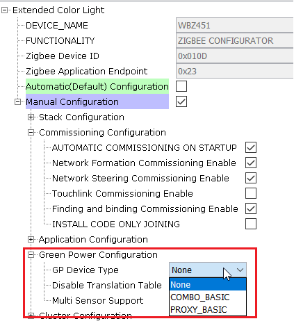 MPLAB Code Configurator (MCC) allows to configure the Zigbee Green Power feature as illustrated in the following image: