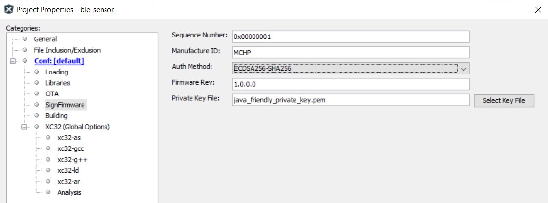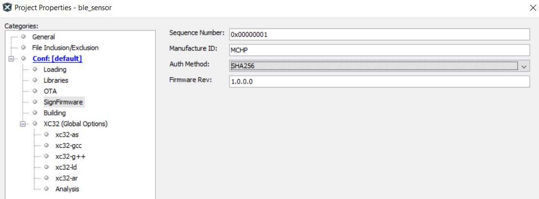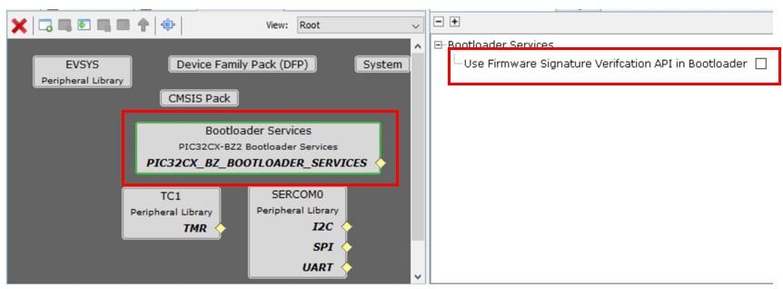 In Device Resource window, expand Harmony – Wireless – Driver, select Bootloader Services component and add it. This component generates the supporting linker file and MPLABX script needed for adding metadata header into application image(Project Properties is added with SignFirmware settings). Use Firmware Signature Verification API in Bootloader is the only option in Bootloader Services component. For DFU via UART, it is not necessary to enable firmware signature and verification, although user can do so if needs. While for OTAU, user must enable firmware signature and verification, by clicking on check box to Use Firmware Signature Verification API in Bootloader.