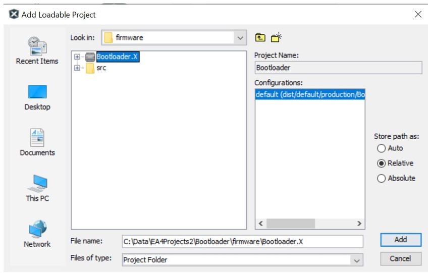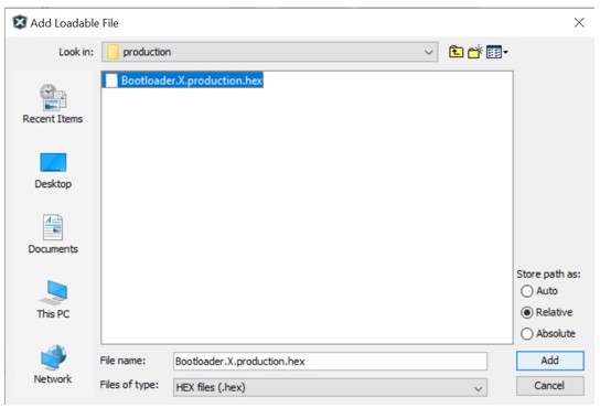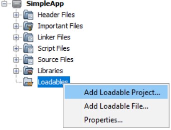 To add Bootloader as loadable file, expand application project’s tree, right click Loadables, select Add Loadable File, then browse and add the bootloader hex file.