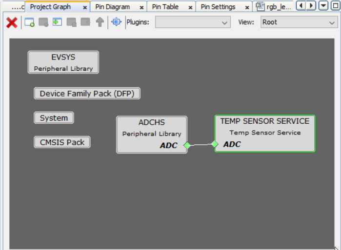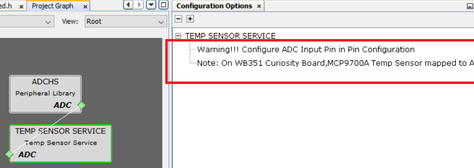 The TEMP SENSOR System service component has dependency of ADC Plib in order to read the temperature from MCP9700A temperature sensor. This component, uses fixed ADC reference voltage, to do the measurement.