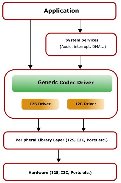 The abstraction model shown in the following diagram depicts how the Generic Codec Driver is positioned in the MPLAB Harmony framework. The Generic Codec Driver uses the I2C and I2S drivers for control and audio data transfers to the Generic module.
