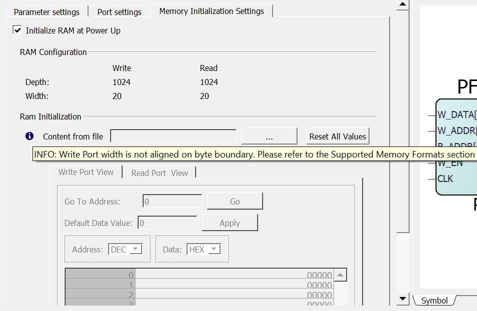 When the tool parses the above memory file data (padded with zeros), it converts the data to binary and reads it as a stream of bits. If the port width is 4 bits, the tool reads 8 bits (byte-aligned), ignores the upper 4 bits of actual data, and stores the lower 4 bits of actual data in RAM, as listed in the following table.