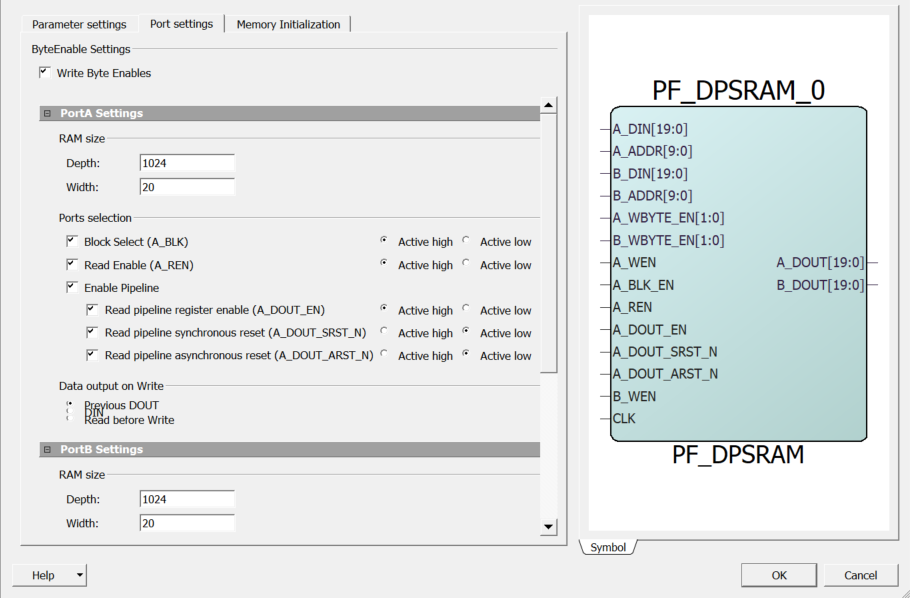 In the Port Settings tab, you can set the RAM size, select ports, and set data output on write settings for both Ports A and B. The following figure shows the PF_DPSRAM block port settings.