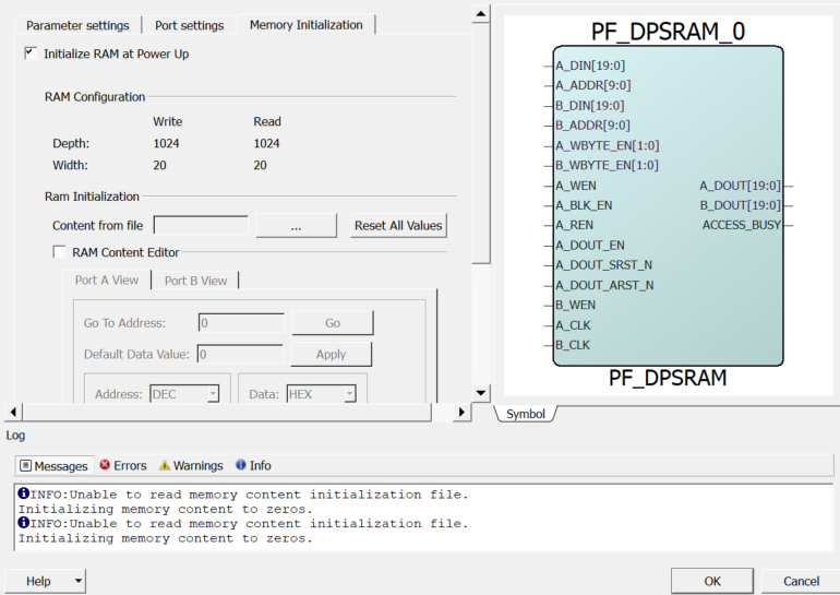 In the Memory Initialization tab, you can initialize RAM at power-up. LSRAM can be initialized during device power-up and functional simulation. The following figure shows the PF Dual Port Large SRAM IP memory initialization.