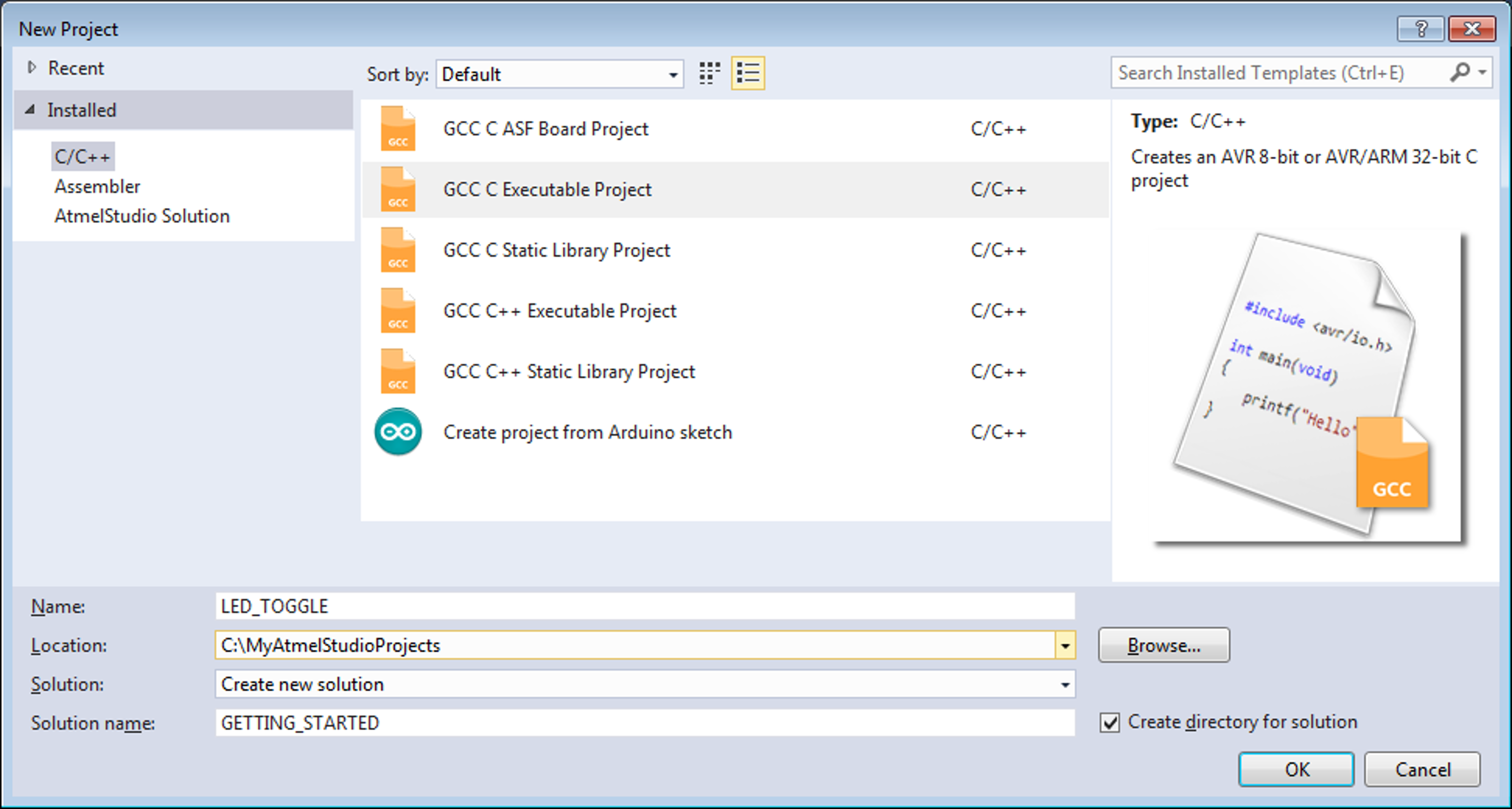 solution and project (e.g. GETTING_STARTED and LED_TOGGLE), and click