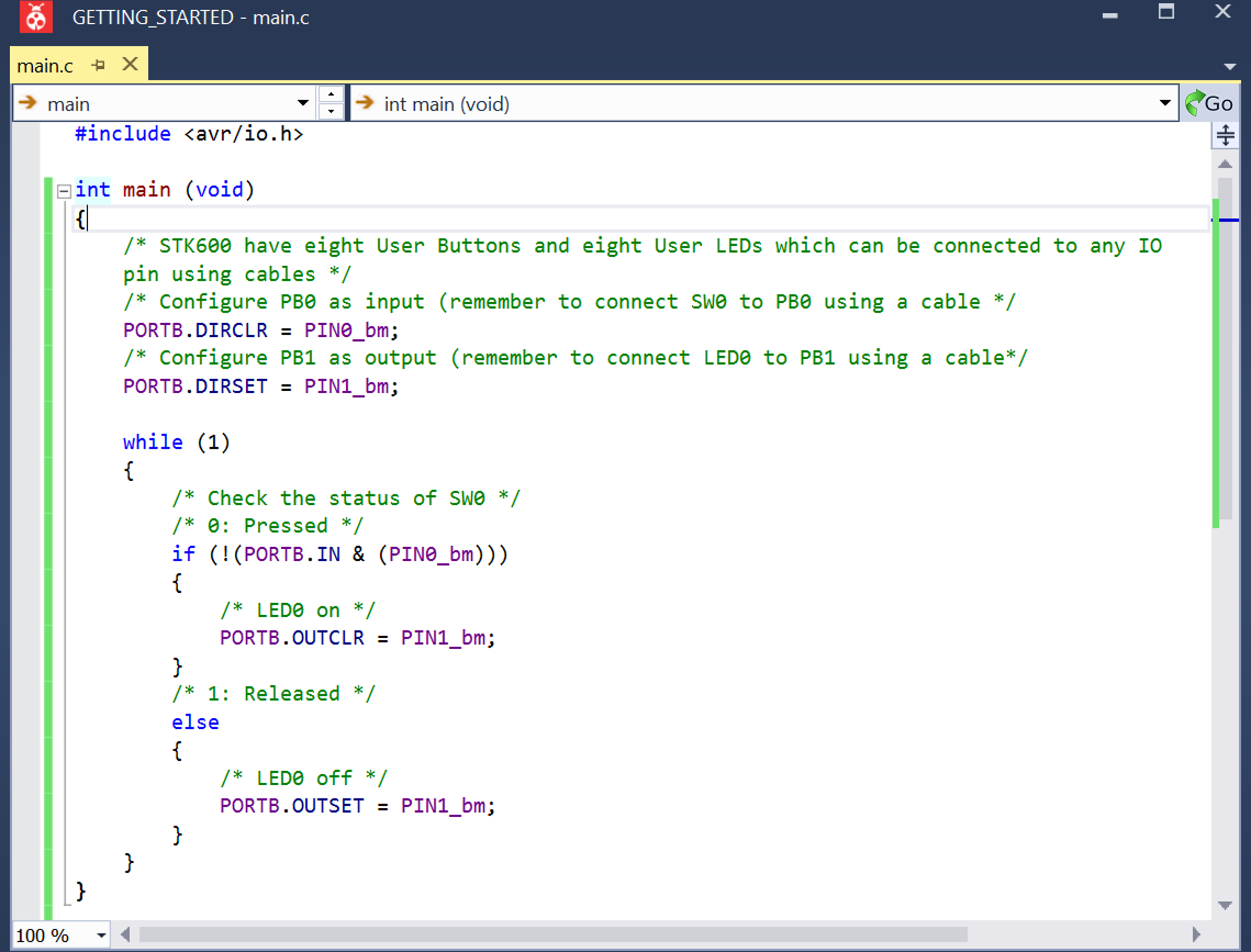In the code editor, the code may appear as shown in the figure below.int main (void) { /* STK600 have eight User Buttons and eight User LEDs which can be connected to any IO pin using cables */ /* Configure PB0 as input (remember to connect SW0 to PB0 using a cable */ PORTB.DIRCLR = PIN0_bm; /* Configure PB1 as output (remember to connect LED0 to PB1 using a cable*/ PORTB.DIRSET = PIN1_bm; while (1) { /* Check the status of SW0 */ /* 0: Pressed */ if (!(PORTB.IN & (PIN0_bm))) { /* LED0 on */ PORTB.OUTCLR = PIN1_bm; } /* 1: Released */ else { /* LED0 off */ PORTB.OUTSET = PIN1_bm; } } }Figure 4-4. Code Editor Window