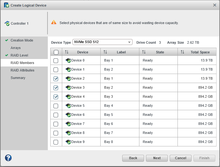 To create a logical drive with NVMe drives of different sizes, follow the instructions in Creating a Logical Drive on a New Array. When the wizard displays the RAID Members panel, select different size drives, as shown in the following figure, then complete the wizard.