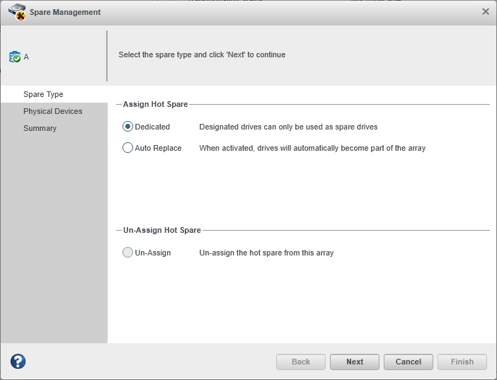 Select the Dedicated spare type, then click
