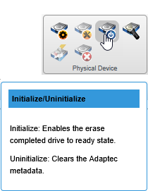 You can initialize or uninitialize any NVMe SSD containing Smart Controller configuration metadata. Initializing a physical device enables the erase completed drive to the ready state. Uninitializing a physical drive clears the meta-data and reserved space from the drive and removes any OS partitions; existing data on the drive is destroyed.