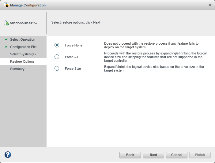 In the Restore Options panel, choose a Force option if a controller does not support
