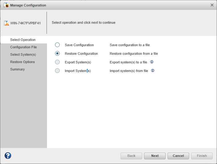 - Select Restore Configuration, then click Next.