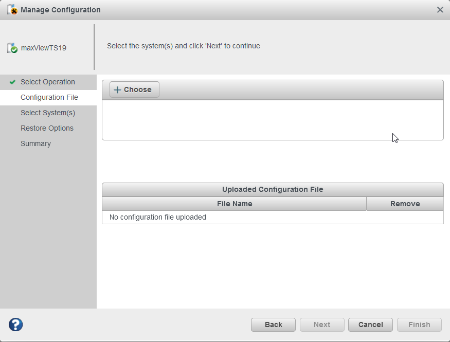 - Click Next, review the summary information, then click Finish.maxView Storage Manager duplicates the system configuration on the new controller.