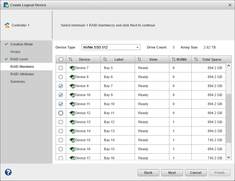 To create a logical drive with NVMe drives of different sizes, follow the instructions in Creating a Logical Drive on a New Array. When the wizard displays the RAID Members panel, select different size drives, as shown in the following figure, then complete the wizard.