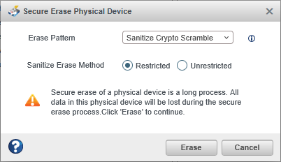 Unrestricted: the drive will be recoverable in the case that the sanitize erase operation fails. Data may still be present on the drive. Not all drives support this sanitize method.