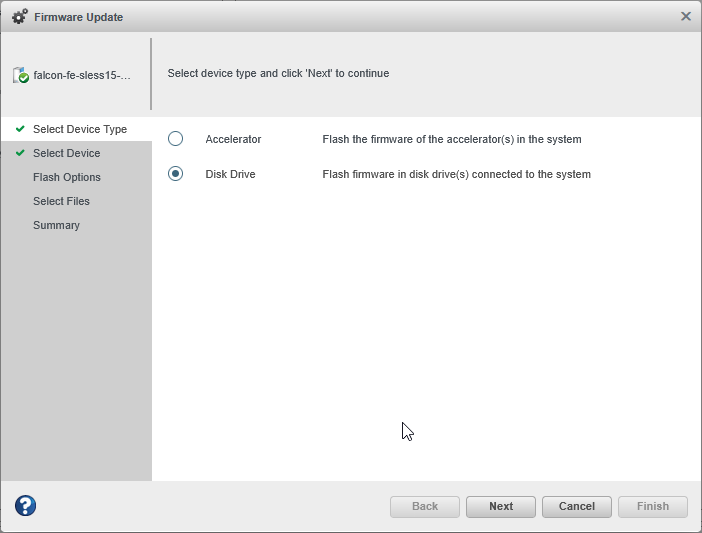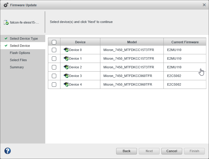 - In the Select Devices panel, select the drive to perform firmware update operation, then click Next.