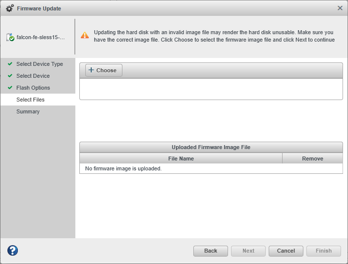 - In the Select Files panel, click Choose, browse the file system for the firmware update file, click Open to select the file (the button label may be different on your browser).