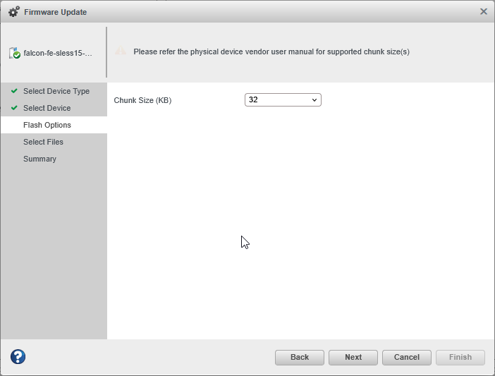 - In the Flash Options panel, select the Chunk Size, from 1-n, in kilobytes (KB), then click Next.