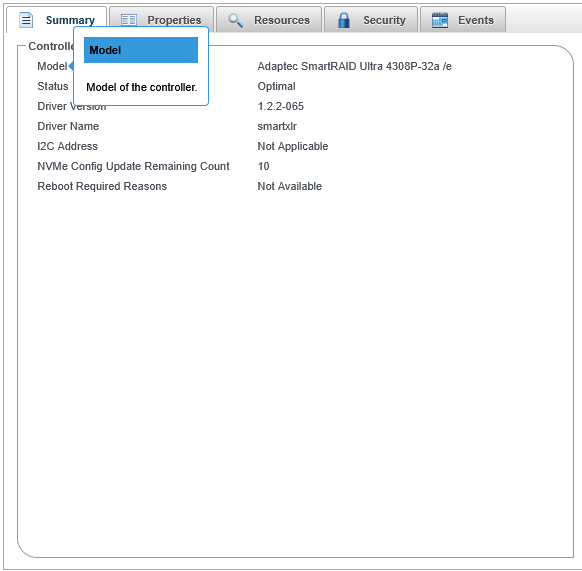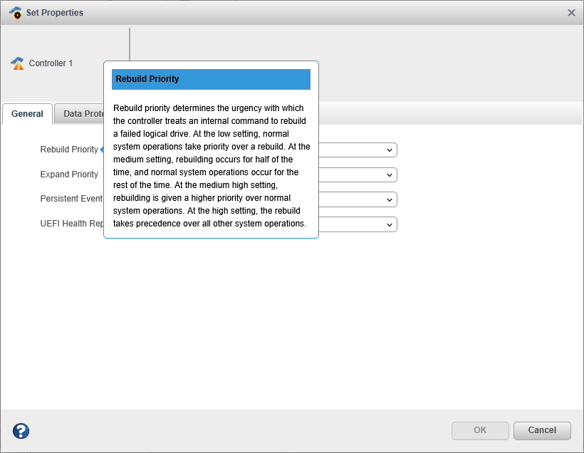 For help with individual options in the Set Properties dialog box (for controllers, logical drives, and physical drives), or specific information fields on the Storage Dashboard, mouse over any field or option name for a brief description of that option.