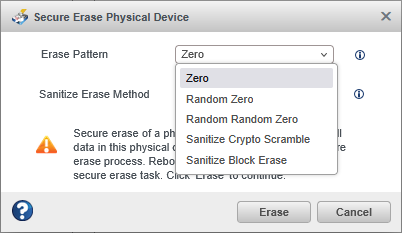 Sanitize Block Erase—(NVMe SSD only) Sets the blocks on the drive to a vendor-specific value, removing all data. It provides a very fast, complete, and robust erasure of the solid state device.