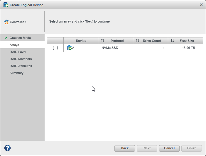 Select the array on which to create the logical drive, then click