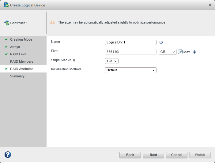- Default—Initializes parity blocks in the background while the logical drive is available for access by the operating system. A lower RAID level results in faster parity initialization.