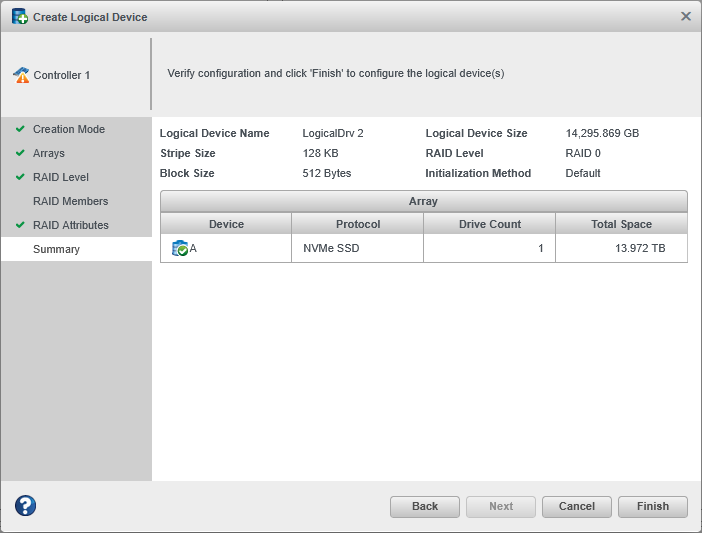 - Change the stripe size—the amount of data, in bytes, written per NVMe drive in the logical drive. (The default stripe size usually provides the best performance.)