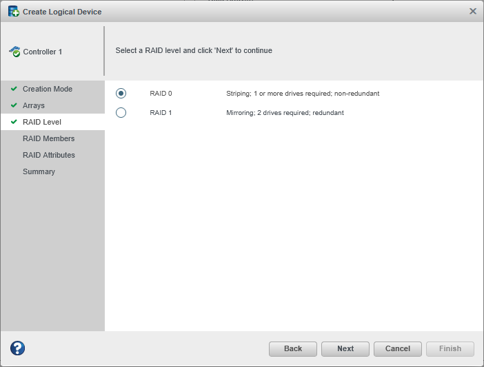 Select a RAID level for the logical drive, then click