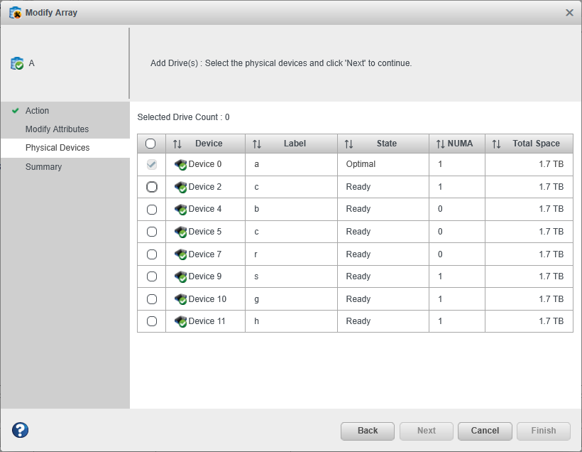 Note: The drives must have sufficient capacity to store the logical drive data. For optimal performance, use the physical device(s) that are attached to the same NUMA node. The selection of physical device(s) that are attached to different NUMA nodes may impact performance. - Click Next, review the summary information, then click Finish.