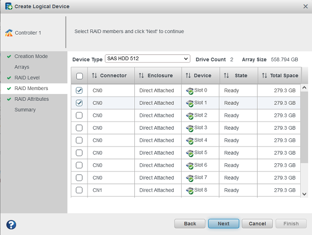 Note: Not all RAID levels are supported by all controllers. (See the Release Notes for more information.) See Selecting the Best RAID Level for more information about RAID levels. - Select the disk drives you want to include in the logical drive,