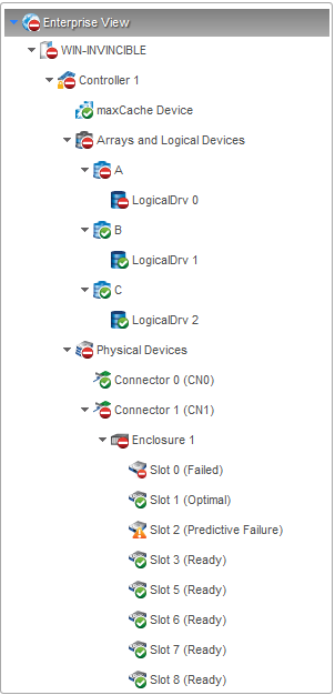 Warning- and Error-level icons appear next to components in the Enterprise View affected by a failure or error, creating a trail, or rapid fault isolation, that helps you identify the source of a problem when it occurs. See Identifying a Failed or Failing Component for more information.