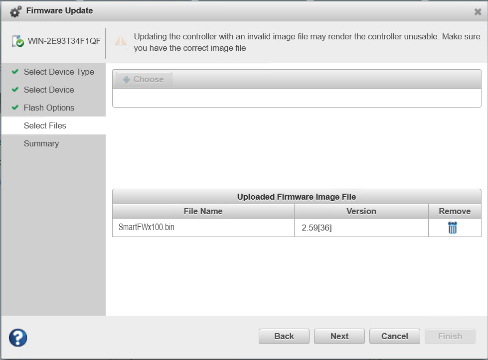 - When the file name appears in the Uploaded Firmware File(s) list, click Next.