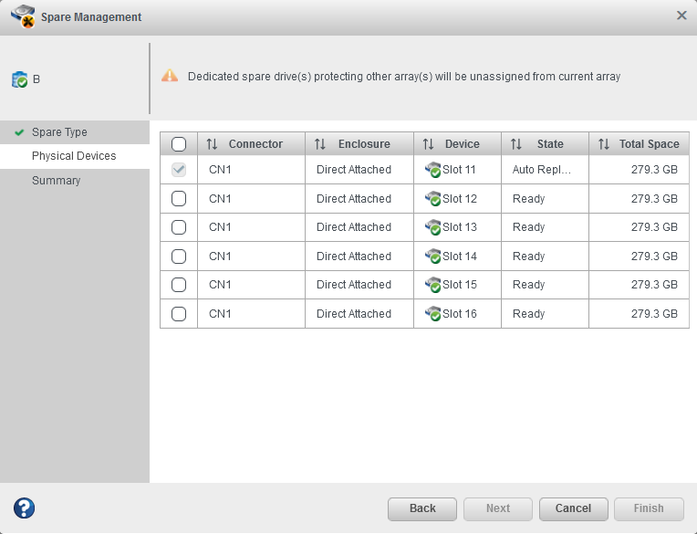 - Review the summary of auto-replace spares and protected arrays, then click Finish.