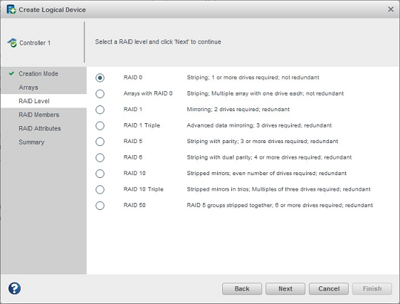 - Select a RAID level for the logical drive, then click