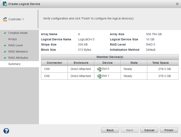 This example shows a RAID 0 logical drive ready to be created on Array A.