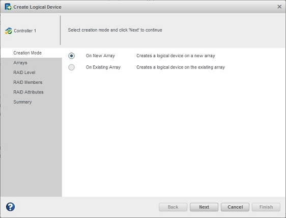 An array must be created before creating a logical drive. Use the On New Array configuration method to step through the process of creating a logical drive on a new array, setting the RAID level, and configuring other settings.
