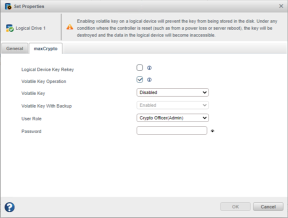 Volatile key is supported only when maxCrypto is operating in Remote Key Management Mode and the logical device is encrypted. Data keys are stored in volatile memory instead of disk. This provides stronger data protection, but it can also cause the data to be inaccessible during power loss when the volatile key is not backed-up.