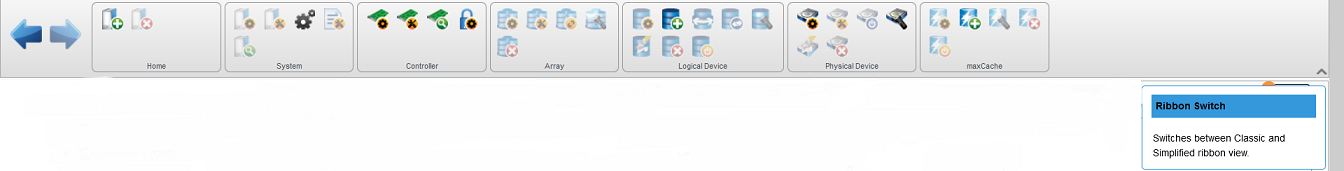 Most tasks in maxView Storage Manager are available from the ribbon, at the top of the main window. The ribbon replaces toolbars and menus in maxView Storage Manager to help quickly find the commands to complete a task.