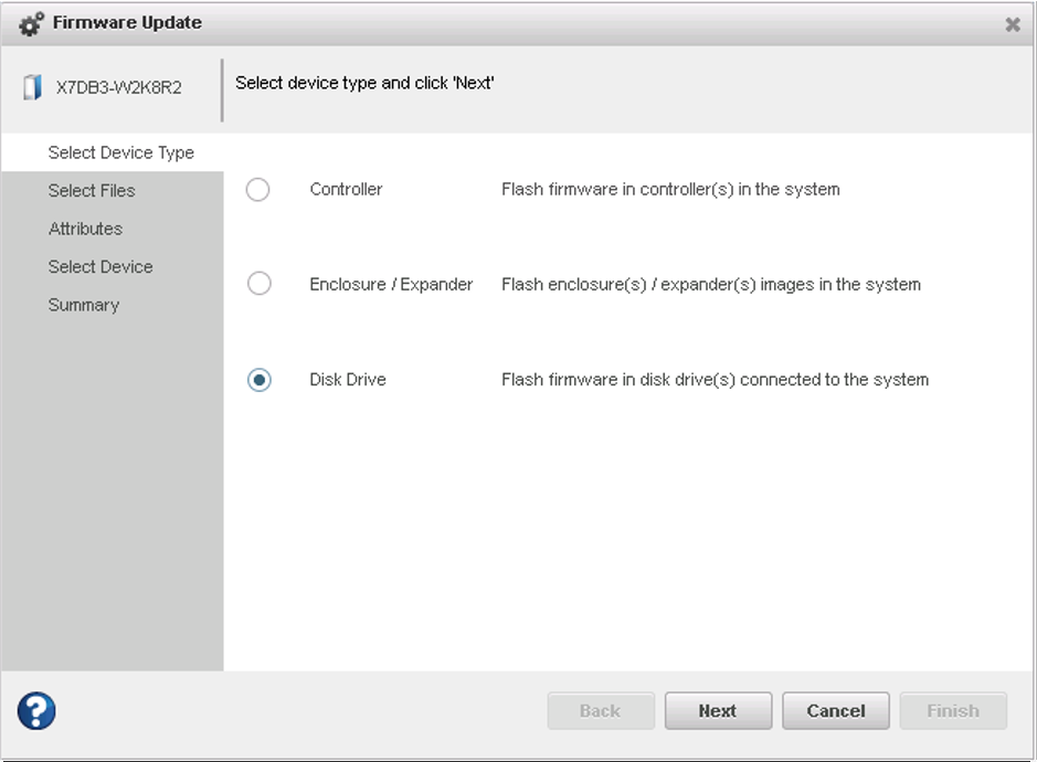 Use the Firmware Update wizard to update the firmware for one or more disk drives of the same type on the local or a remote system. The procedure is similar to updating the controller firmware (see Updating the Controller Firmware ).