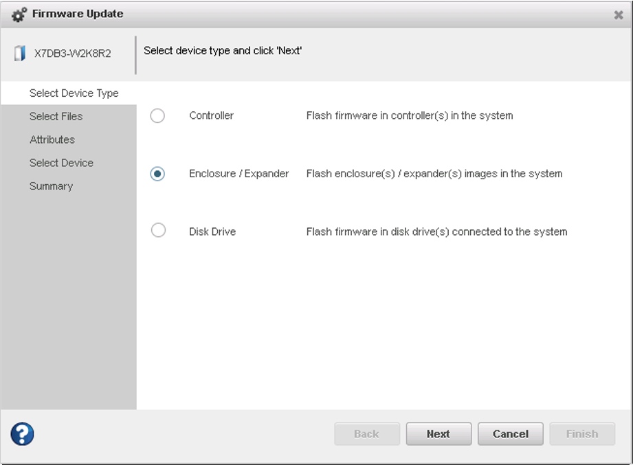 Use the Firmware Update wizard to update the firmware for one or more enclosures or expanders of the same type on the local or a remote system.