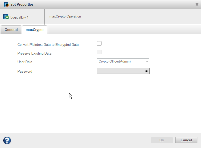 Use this operation to convert plaintext data to encrypted data. You can convert an unencrypted logical drive or all unencrypted logical drives on an array. Additionally, you can choose to preserve or discard the existing data during conversion.
