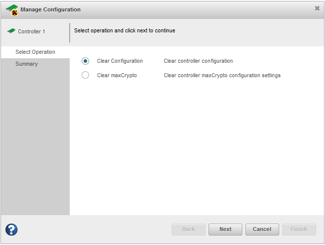 The Manage Configuration wizard opens. - Select Clear Configuration, then click Next.