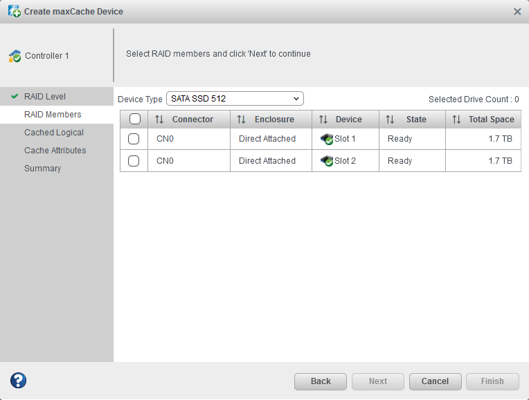 Select the SSDs that you want to include in the maxCache Device,