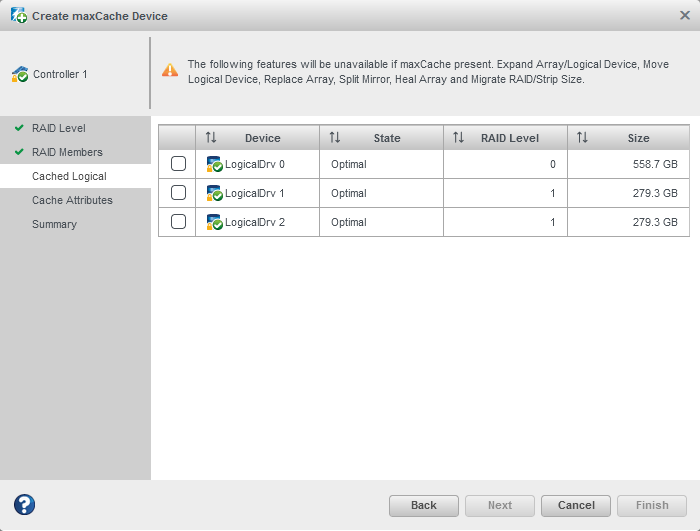 Select the Cache Line Size. The Cache Line Size impacts the cache performance and the maximum size selected. To create a large size maxCache you need to select the larger cache line size supported by that controller.