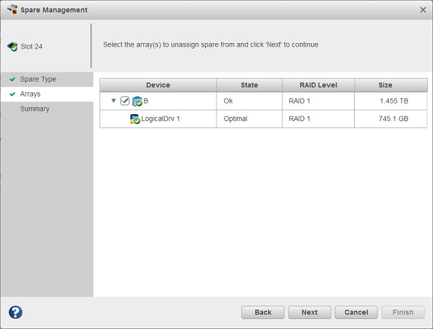 You can remove a dedicated or auto-replace hot spare from an array. Removing the last hot spare from an array returns the drive to the Ready state.
