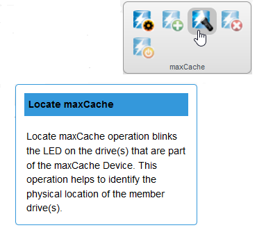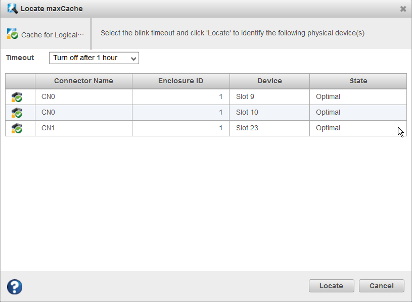 The Locate maxCache window opens, displaying a list SSDs comprising the maxCache Device. - Select the time-out period from the drop-down list: 1 hour, 4 hours, 24 hours.