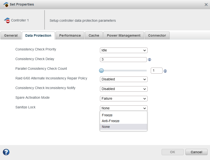 Changing the Sanitize Lock will require a reboot to apply the new state to the controller, and require all physical devices to be power cycled or hot-plugged for the lock state to be applied to the physical devices. - Click OK.