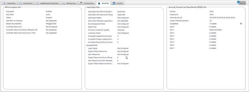 To check the maxCrypto status, select a controller in the Enterprise view, then click the Security tab on the storage dashboard. Before completing the initial setup steps, most maxCrypto properties will be listed as "Not Configured". After completing the initial setup steps, the main maxCrypto properties will be Configured, see the following table.