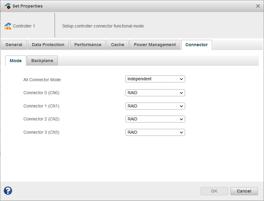 By default, products with RAID support are configured to operate in Mixed Mode. Mode options vary, depending on the configuration of logical and physical devices on the connector. For example, you cannot switch the connector to HBA mode if the connector is already configured with a RAID volume.